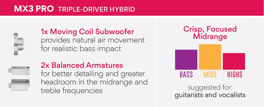 Tre hörlurselement, två balanserade element + rörlig spolehybrid